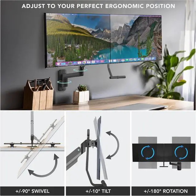Professional ergonomics This height adjustable dual monitor wall mount offers a 10.6 vertical range, ±10° tilt, ±90° swivel, and ±180° rotation. Fine-tune viewing angles to reduce neck strain and maintain natural eye alignment through long work sessions.