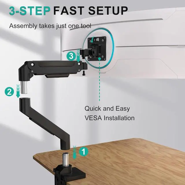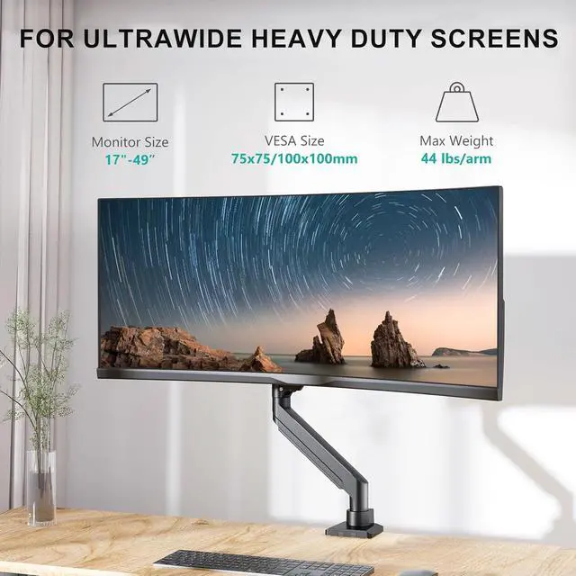 Ultrawide Compatibility: WALI heavy duty monitor arm for ultrawidestandard flat and curved monitors up to 49" holds 44 Lbs, with 75x75mm or 100x100mm VESA patterns.