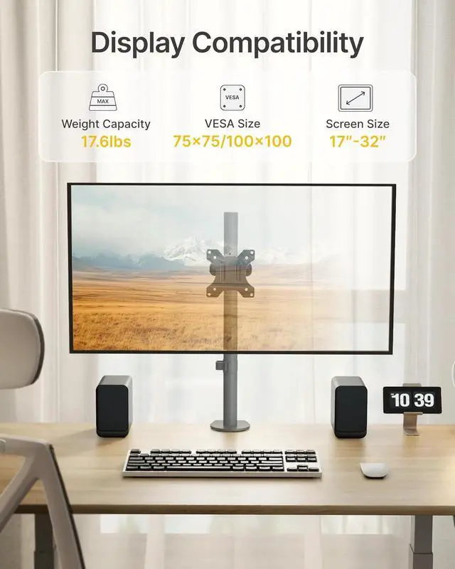 Bracket Pole Mount CompatibilityMonitor pole mount is suitable for 17-32 monitors or TVs, maximum load 17.6 lbs, VESA pattern 75x75mm/100x100mm. VESA pole mount is sturdy and durable, ensure high stability, can be securely fastened to any 1.1 - 2.4 diameter pole to meet a variety of needs.