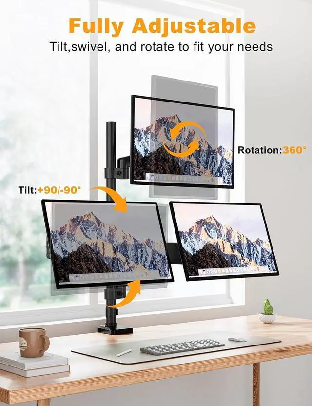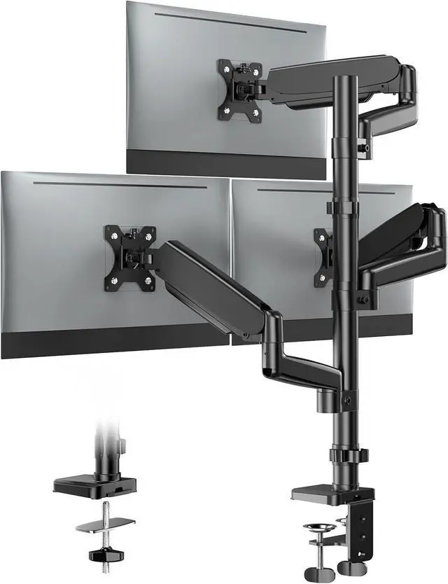 • Reclaim Your Valuable Desk Space - Maximize your workspace! By lifting your monitors off the desk, this triple mount instantly frees up a significant amount of room. Organize your desk for good and enjoy a clean, spacious, and clutter-free workstation that boosts your focus and productivity.