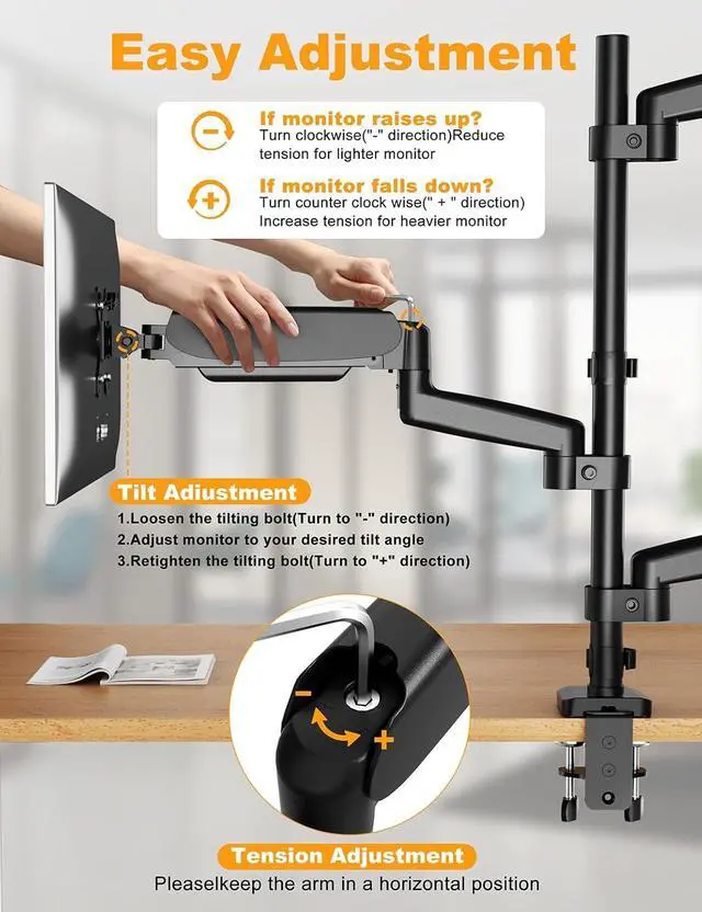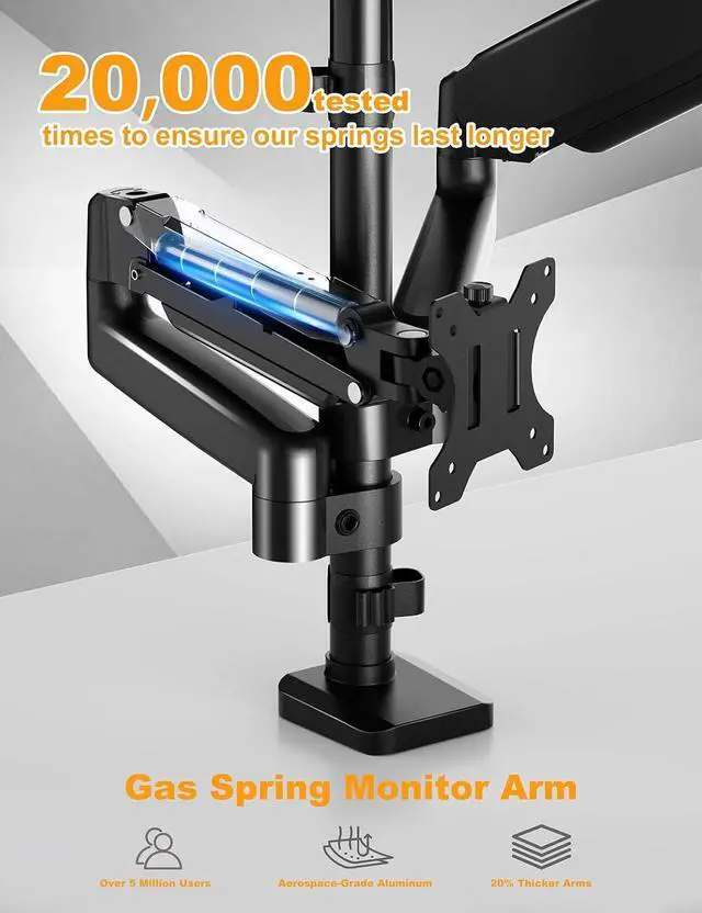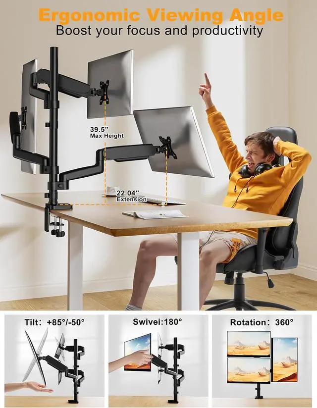 Effortless Ergonomic Adjustment - Customize your perfect viewing angle with ease. The advanced gas spring arms allow you to smoothly swivel, tilt, and rotate each monitor with minimal effort. Easily switch between landscape and portrait modes to optimize your workflow for coding, writing, browsing, or streaming.