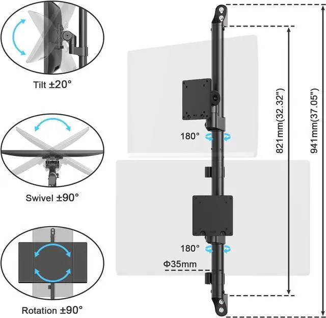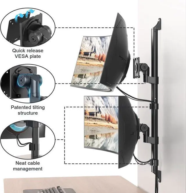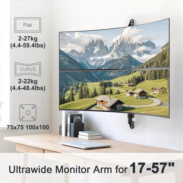 Dual Stacked Monitor Mount: Holds 2 ultrawide screens up to 57 vertically with VESA 75x75 mm or 100x100 mm compatibility.