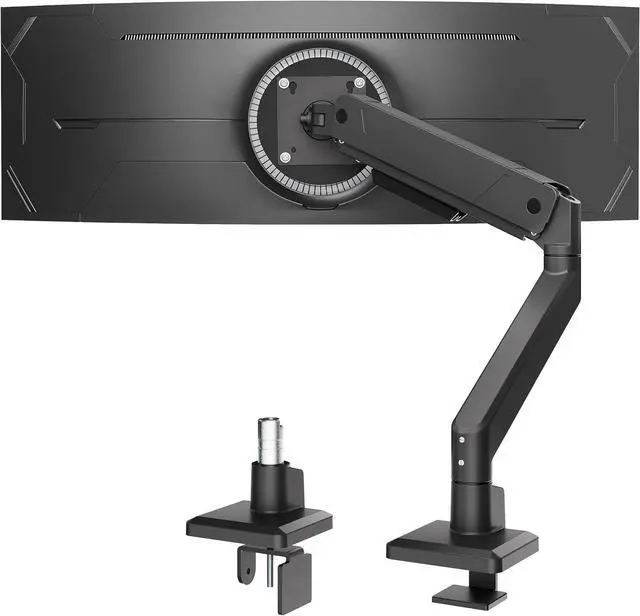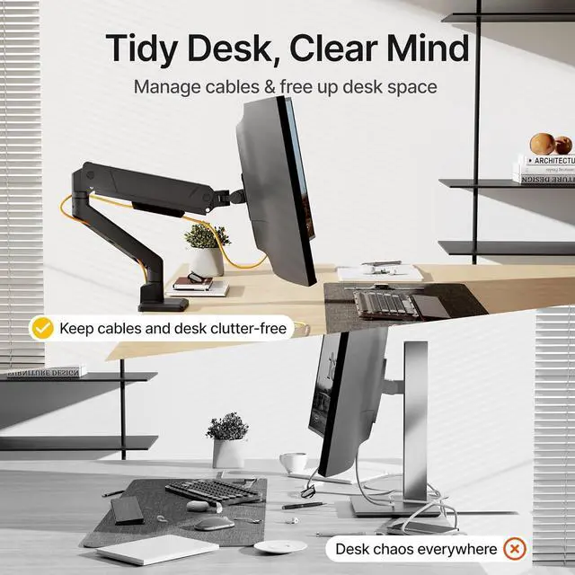 Streamline Desktop Space: monTEK single monitor mount features a compact, low-profile base and elevated arm design, lifting your screen off the surface to free up valuable desk space. The ultrawide monitor arm also features integrated cable management, keeping power lines hidden and untangled, for a workspace that stays sleek, spacious, and clutter-free.