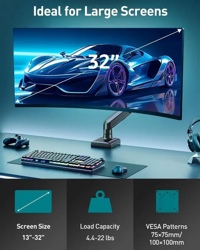 Universal Monitor Mount: Our single monitor arm perfectly fits most flat or curved LCD/LED screens ranging from 13" to 32", with a max load capacity of 22 lbs, suitable for VESA patterns of 75x75mm & 100x100mm. Compatible with ASUS, Acer, Samsung, LG, AOC, Dell, etc., not limited to 32 30 28 27 25 24 23 22 21 20 19 17 inch screen, but not compatible with 1000R/1500R/1800R curved screens.