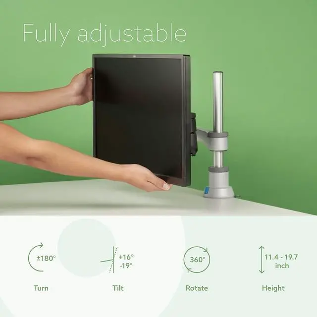 FULLY CUSTOMIZABLE USER EXPERIENCE: Enjoy a completely customer-friendly experience with a single monitor stand that offers full customization. The articulated arm allows easy rotation, comfortable height adjustment along the center pole, +40° to -40° tilt, 180° swivel, and 360° rotation. Arm extends and retracts, tilt to change reading angles, and rotate Monitor from landscape-to-portrait mode.