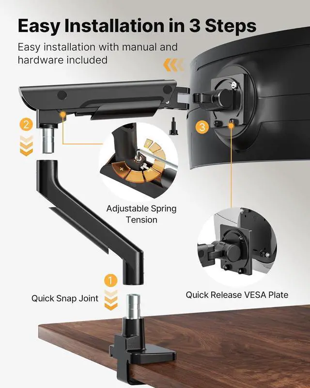 Quick 10-Min Assembly No Crawling Under DeskInstall in just 10 minutes using the topside-mounted C-clamp or grommetno need to reach under your desk. Features a tool-free quick-release VESA plate and detachable arm joint for a streamlined setup. Fits desks from 0.47 " to 1.8 " thick.