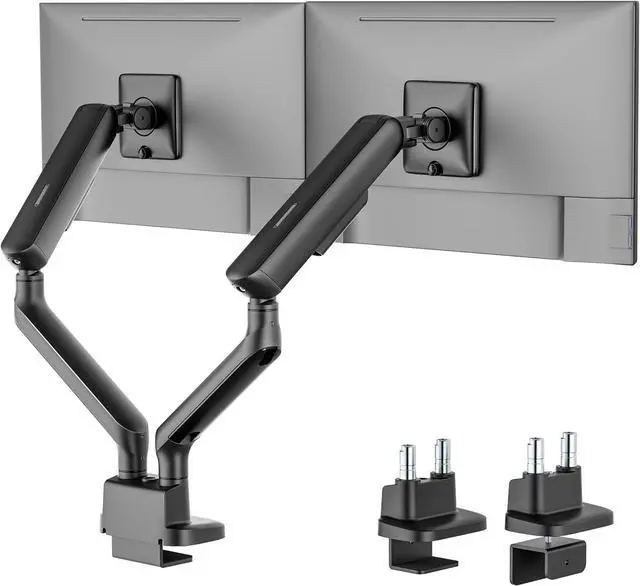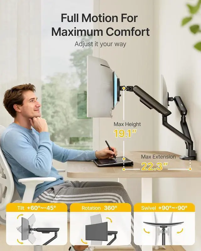 FULLY ADJUSTABLE FOR COMFORTABLE VIEWING: Enjoy total flexibility with -45° to +60° tilt, ±90° swivel, ±180° rotation, and 9.3 " 19.2 " height adjustment. This VESA dual monitor mount allows precise positioning for ergonomic comfortlift your screens to reduce neck strain, angle them for optimal viewing, and easily switch between tasks without eye fatigue.