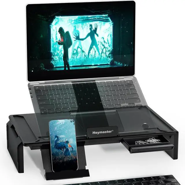 MULTIFUNCTIONAL DESK ORGANIZEREach monitor stand with drawer comes with 1 phone/tablet holder, 1 storage drawer and 2 pen slots, making it easy to keep your phone, tablet and office accessories at the ready, and you can also place your keyboard under this desktop monitor stand to help keep your workspace organized.