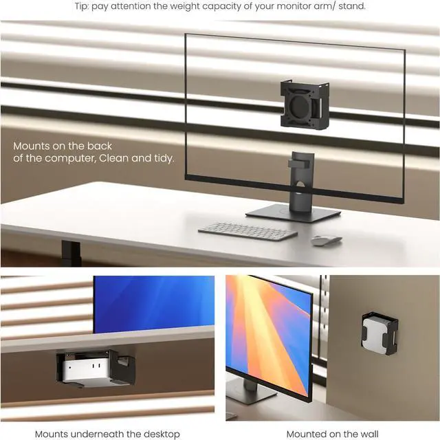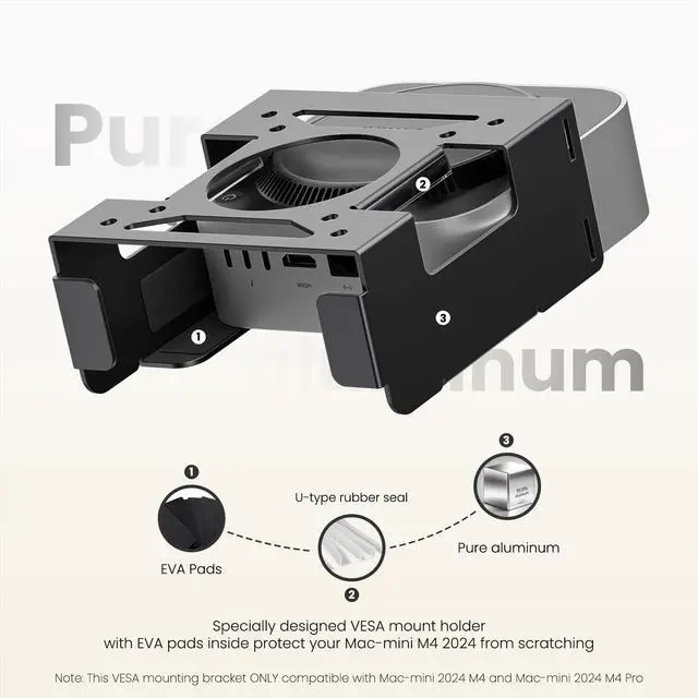 The VESA mounted holder is constructed from pure aluminum metal with EVA foam padding inside to prevent scratches and abrasion resistance, providing enhanced protection. Monitor mounted bracket has an anti-theft function because of two alternative anti-theft bars (NOT include lock). Protect your Mac-mini M4 2024 from being stolen or moved around at will!