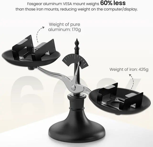 Made with pure aluminum to make our VESA mount lighter. Compared to other iron mounts, Fasgear monitor VESA mount can reduce weight by 60%, thus lightening the weight burden on your computer/display. Besides, please pay attention to the weight capacity of the mounting bracket to use the monitor arm/ stand lifting function. The total weight of the mount and the Mac-mini M4 2024 is 0.84KG, total weight of the mount and the Mac-mini M4 Pro 2024 is 0.9KG