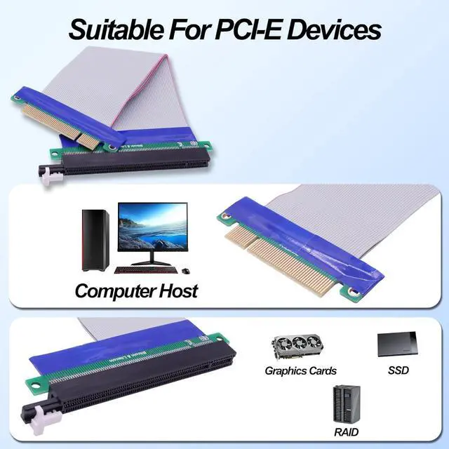PCI-E Riser Cable supports high-speed PCIe adapters and devices, such as PCIe 8x 16x graphics cards, sound cards,disk controllers, SSD RAID controllers cards etc.