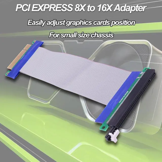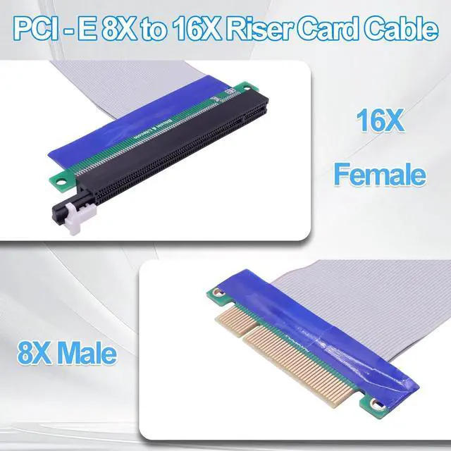 This PCI-E 8X to 16X Flexible Ribbon Riser cable connection adapter card, designed for 1U and 2U server small chassis expansion. In standard machines, when the PCI-E16X slot is occupied and affected by other PCI-E16X devices, a soft PCI-E8X adapter cable is used to transfer the PCI-E16X slot to use PCI-E16X devices.
