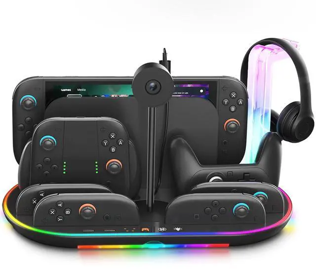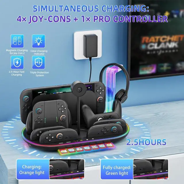 Charger for Switch 2 - the charging station is specially designed for Switch 2. It can charge with the Switch 2 Pro controller and 4 JoyCons controllers at the same time. The magnetic design makes it easy to charge the JoyCons, with clear LED indicators to let you know when your devices are charging (orange) or fully charged (green).