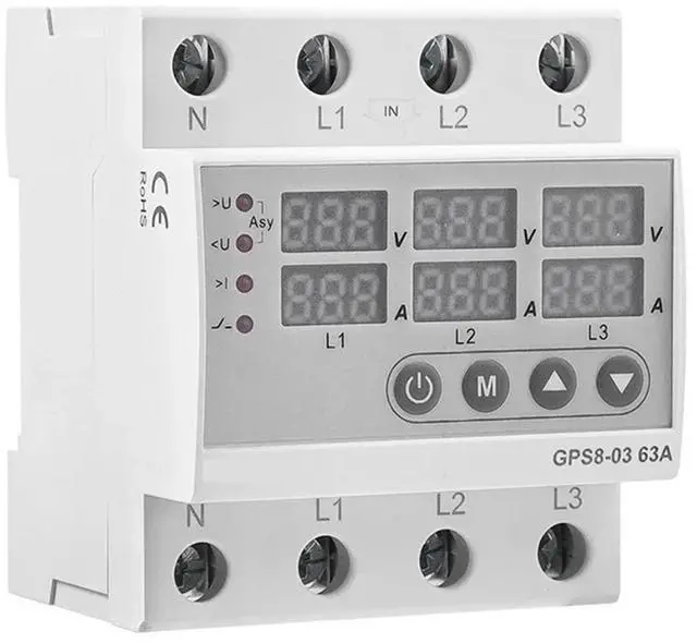 GPS8-03 Din Rail 3 Phase Adjustable Voltage Relay Over Under Voltage Monitor with Current Protection 63A 80V-400V(GPS8-03-U-63A)