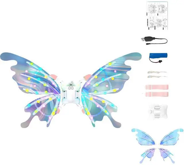 Blue Electric Fairy Wings for Girls, Light Up Butterfly Wings with Music and Rainbow Film, Motion Butterfly Wings, 3.7V Battery, USB Charge Cable, Include Straps