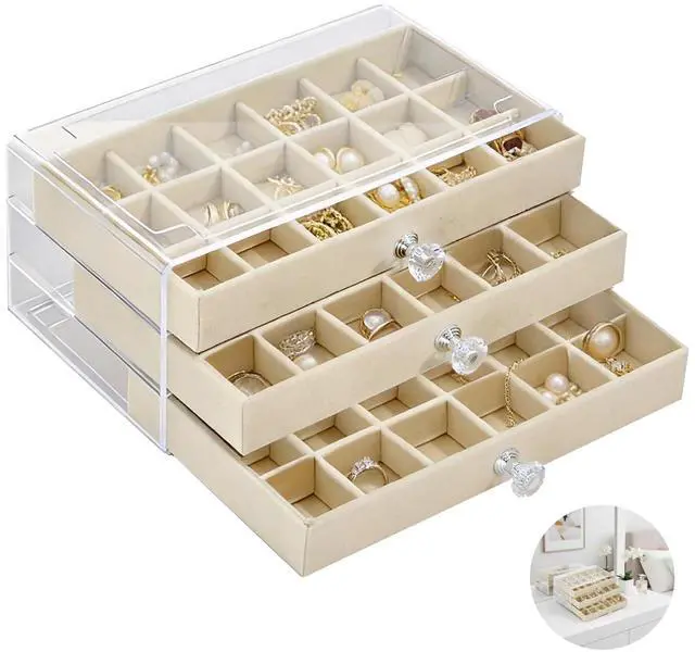 • Acrylic Jewelry Display Case, 3-Layer Velvet Earring Organizer, 54 Compartments, Beige, 9.3X5.3X4.1 In