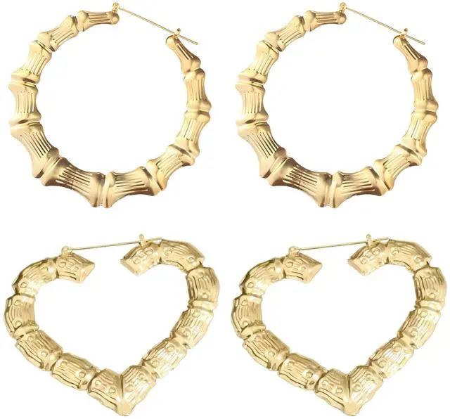 2 Pairs Hoop Earrings For Women, Gold, 2.6 In/6.5 Cm, Heart Design Statement Earrings