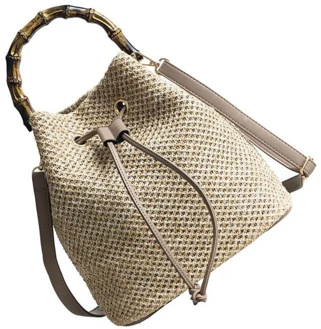 • Straw Drawstring Bucket Shoulder Bag Womens Crossbody Pouch Woven Handbag Summer Beach Tote with Top Handle