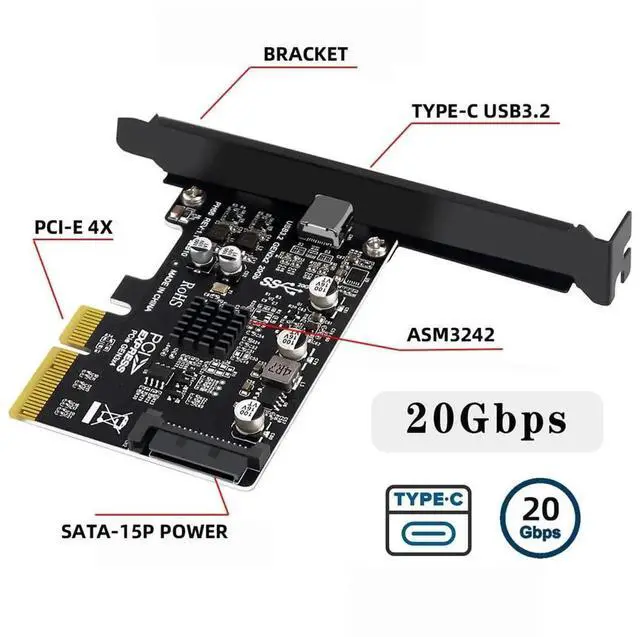 The adapter is a converter to convert the available PCI-E 4X/8X/16X of a motherboard into a USB 3.2 Gen2 Type-C 20Gbps USB-C port.