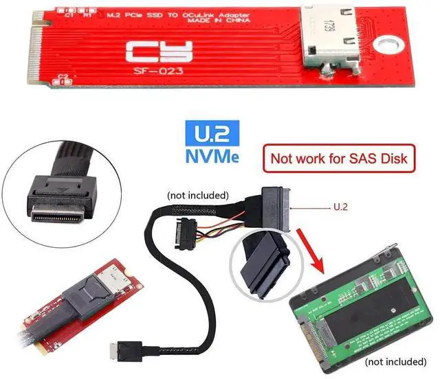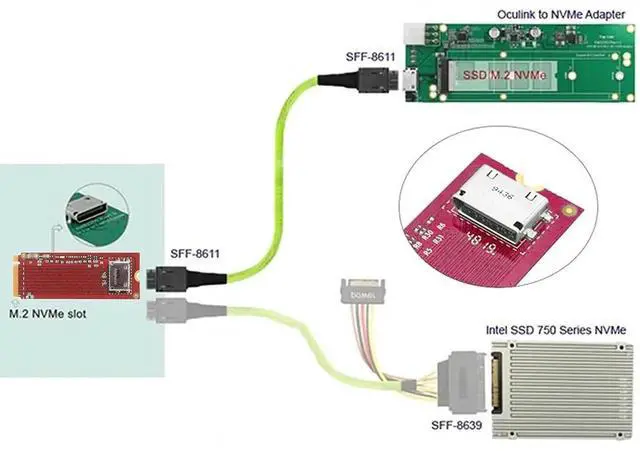 PCI-E 3.0 M.2 M-key to Oculink SFF-8612 SFF-8611 Host Adapter for PCIe Nvme SSD This convertor expands the system by one SFF-8612 interface. It can be connected e.g. one SSD by using an optional cable. The card transmits PCI Express signals using the NVMe protocol. Specification Connectors: 1 x OCuLink SFF-8612 female 1 x 67 pin M.2 Key M male Data transfer rate up to 32 Gbps Bootable, ex UEFI version 2.3.1 Supports NVM Express (NVMe) 1.2 System requirements Linux Kernel 4.3 or above Windows 8.1/8.1-64/10/10-64 A free M.2 interface with key M