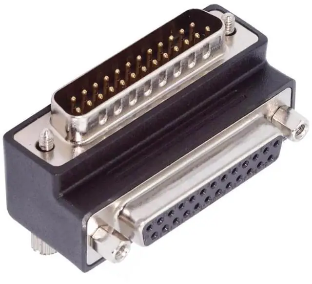 The 25Pin male with nuts and the Female with Screws. 25 pin density plug to socket adaptor. Two rows contacts 90 Degree Angled Adapter.
