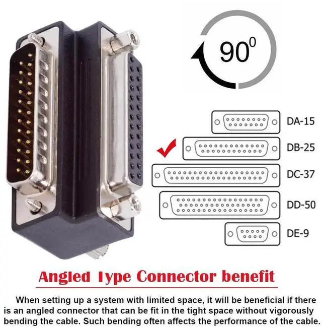 • The 25Pin male with nuts and the Female with Screws. 25 pin density plug to socket adaptor. Two rows contacts 90 Degree Angled Adapter.
