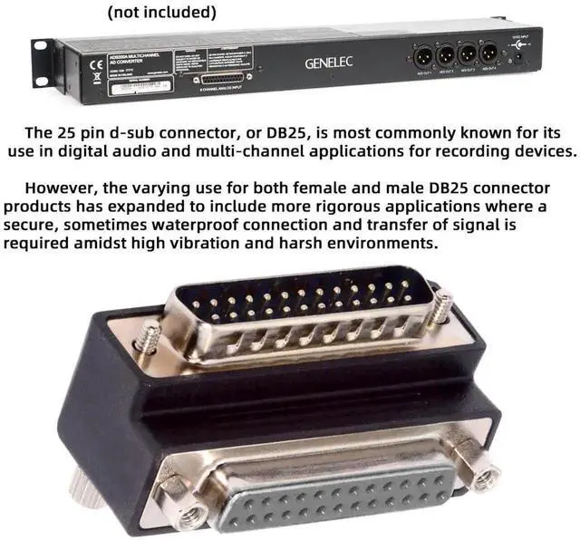 The 25 pin d-sub connector, or DB25, is most commonly known for its use in digital audio and multi-channel applications for recording devices. However, the varying use for both female and male DB25 connector products has expanded to include more rigorous applications where a secure, sometimes waterproof connection and transfer of signal is required amidst high vibration and harsh environments.
