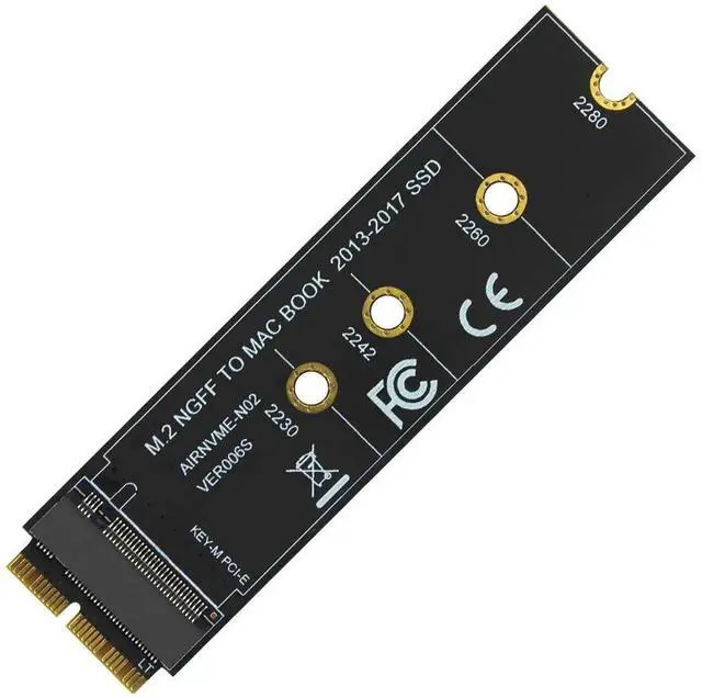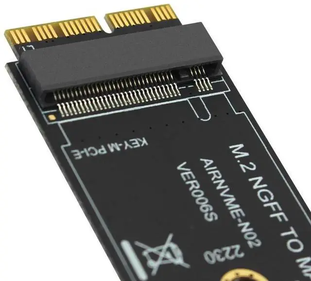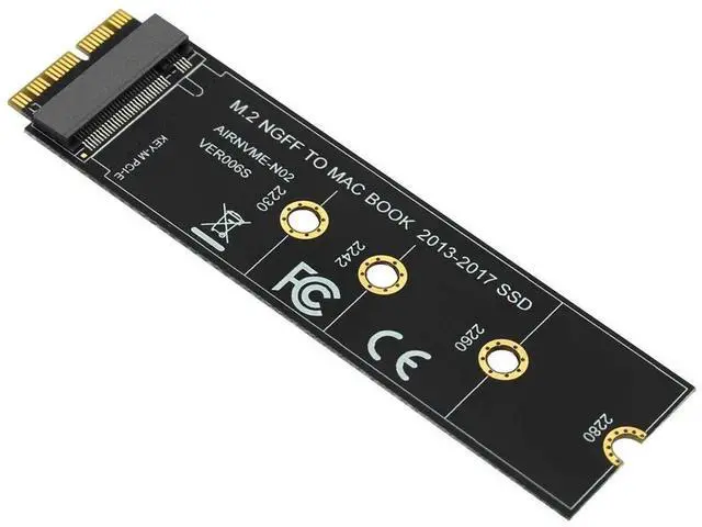 Features: 1. This product only compatible with late 2013 version Mac-book air A1465 and A1466, late 2013 version Mac-Book Pro re-tina A1398 A1502, Please confirm that your laptop is fit. The adapter card support 2230, 2242, 2260, 2280 size of M.2 NGFF PCIe x4 AHCI Protocol SSD, it can not support M.2 NGFF PCIe x4 NVMe solid state drives. 2. The speed and other properties is not changed,only form conversion interface. 3. No need extra power adapter and any drivers. This product only supports the following computer models: Late 2013 version Mac-Book Pro re-tina A1398 A1502 (ME864 ME865 ME866 ME293 ME294), 2014 version Mac-Book Pro re-tina A1502 A1398 (MGX72 MGX82 MGX92 MGXA2 MGXC2), 2015 version Mac-Book Pro re-tina A1502 A1398(MF839 MF840 MF841 MJLQ2 MJLT2 MJLU2), 2013-2014 version Mac-Book Air A1465 A1466(MD711 MD712 MD760 MD761), 2015 version Mac-Book Air A1465 A1466(MJVM2 MJVP2 MJVE2 MJVG2 MMGF2 MMGG2), 2017 version Mac-Book Air A1466(MQD32 MQD42 MQD52, Model A1466 EMC3178), Mac Pro ME253 MD878, i-MAC A1419(Late 2013 and newer). Package included: 1 x M key M.2 to 12+16Pin interface Adapter Card