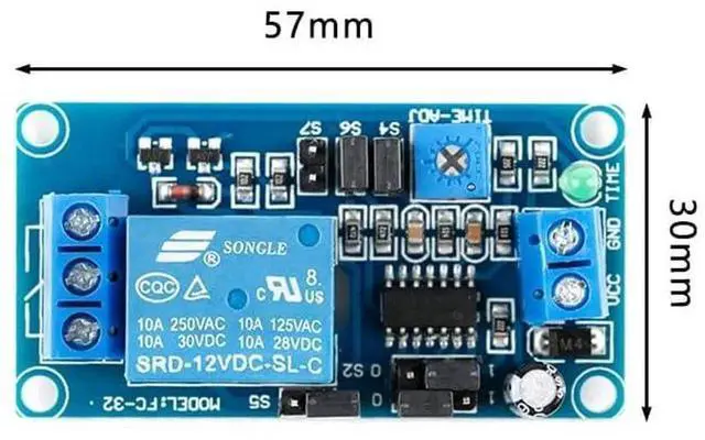 2. When the S7 jumper cap is plugged in on the module and S6 is not plugged in, as soon as the module is powered on, it immediately starts timing (with an adjustable time range). At this time, the relay does not close (not connected), the delay ends, the relay closes, and the common terminal and normal start are connected.