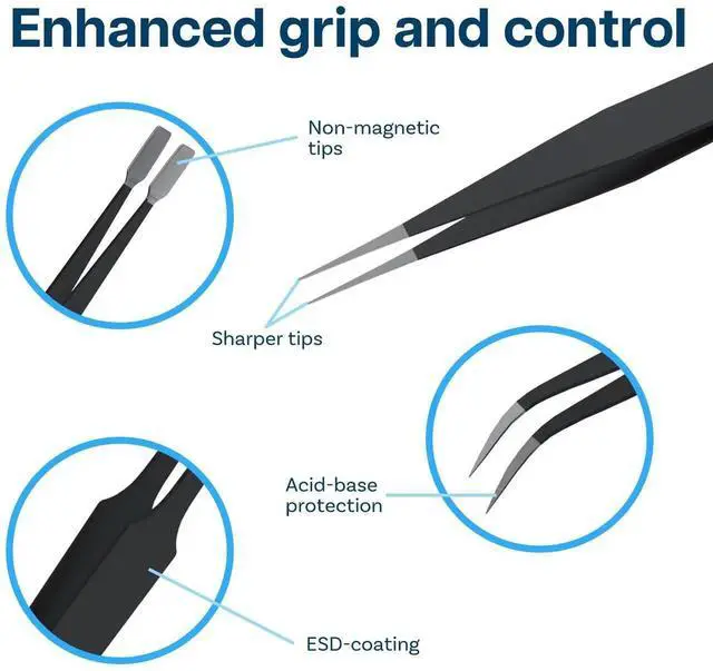 This tweezer set is designed for electronics work, these tweezers feature advanced Electrostatic Discharge (ESD) protection. The anti-static stainless steel construction safeguards sensitive electronic components, making them an essential tool for professionals and DIY enthusiasts alike. It will not cause static damage to sensitive electronics.