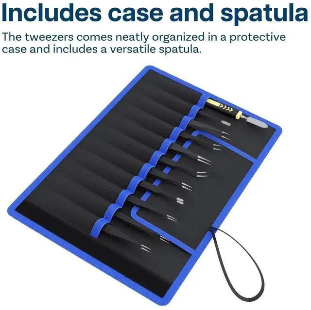 In addition to the 10x Industrial Precision ESD Tweezers, this set includes a versatile spatula. The spatula provides additional support for tasks that require gentle prying and separating, offering a well-rounded solution for various applications. The set comes neatly organized in a protective case, ensuring convenient storage and easy portability.