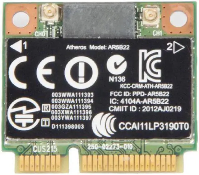 Condition: UsedBrand Name: AtherosModel: AR5B22Interface: Mini PCI-E half heightStandard: 802.11 a/b/g/nSpeed up to 300MbpsDual band:2.4Ghz 5GhzSupport Bluetooth 4.0OS:Windows 7 Windows 8