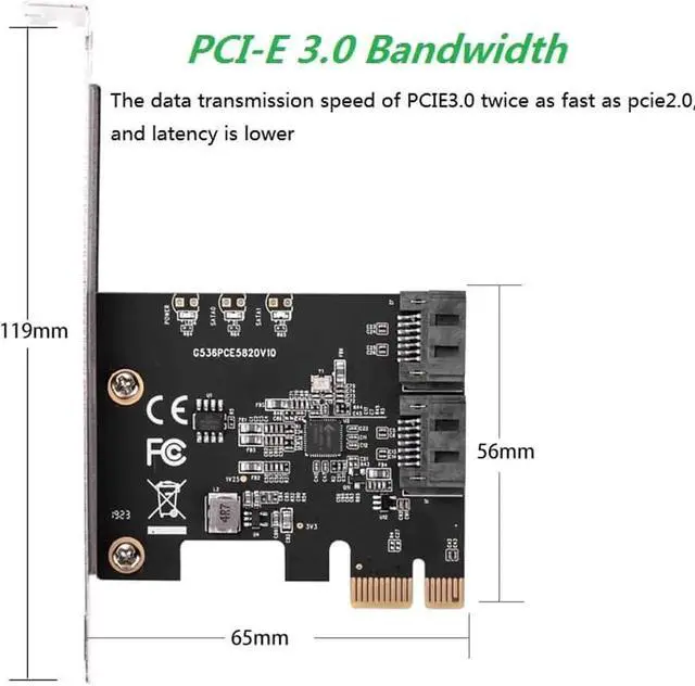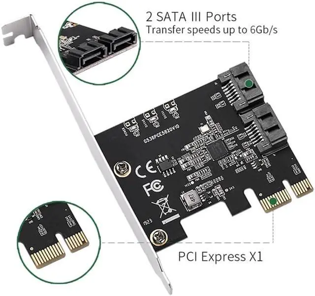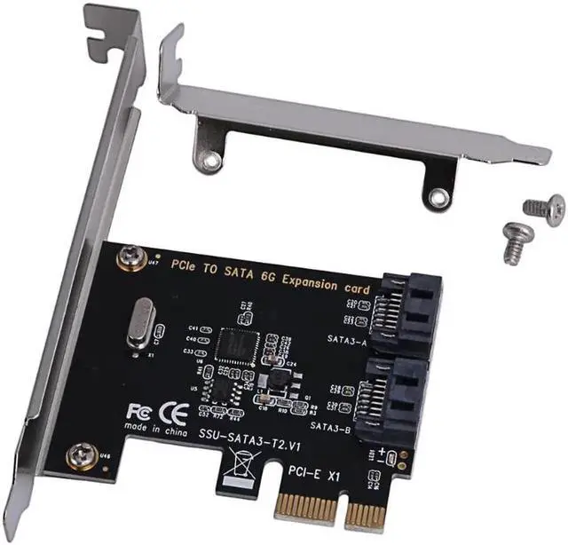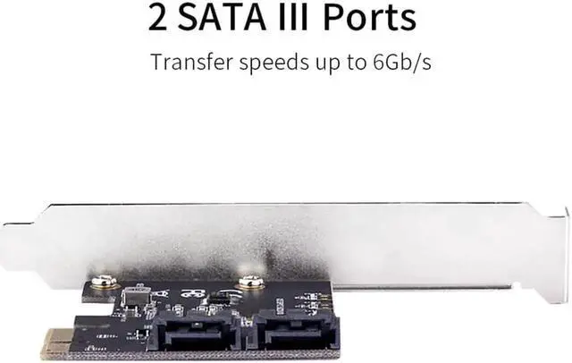 Features Supports one lane of PCI Express. Complies with PCI Express Base Specification Revision 3.1 a. Supports PCIe link layer power saving mode. Supports 2 SATA port. Complies with SATA Specification Revision 3.2. Supports AHCI mode and IDE programming interface. Supports Native Command Queue (NCQ). Supports SATA link power saving mode (partial and slumber) Supports SATA plug-in detection capable. Supports drive power control and staggered spin-up. Supports SATA Partial / Slumber power management state. System Requirements Windows 7 (X86/X64) Windows 8/8. x / 10 (X86/X64) (Windows in-box driver) Linux-base OS Package Contents 1 × PCIe Gen3x1 to 2 x SATA 6Gb/s Card 1 × SATA Cable 1 × User Manua 1 × Low