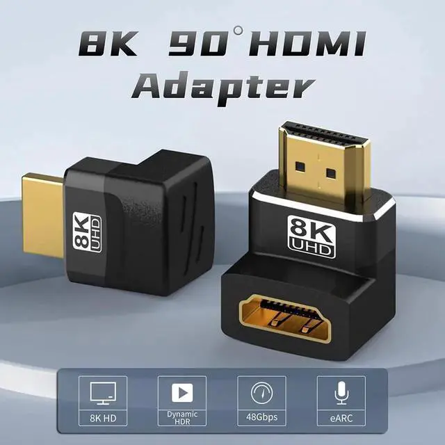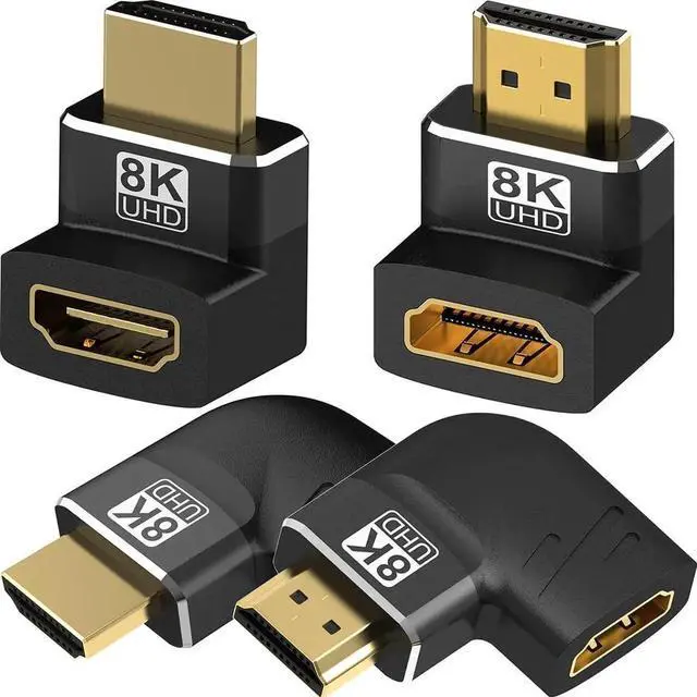 Upgraded HDMI 2.1 Standard: Truely support for Dynamic HDR, AMD FreeSync, NVIDIA G-SYNC, eARC, Dolby Vision, HD Dolby 7.1, Dolby Atmos, BT.2020, ALLM, VRR, HFR, QMS, QFT, DSC 1.2 a Compatible with HDCP 2.3 to watch content protected videos. 8K Resolution: Supports 8K@60Hz and 4K@120Hz, provides resolutions up to 7680x4320 60Hz, backward compatible with 6K@60Hz, 5K@60Hz, 4K@144Hz, 2K@240Hz, 1080P@60Hz, etc. Supports 3D effects, bringing you a cinematic immersive visual experience. Suitable for Narrow Space: 2-Combos of left right up down 90 degree HDMI adapters can be conveniently selected for actual needs, which is super handy for connecting HDMI cables at narrow space, It perfectly protects your cables from bending damage or breakage and also reduces the stress on ports of valuable devices. Premium Material: Adopt 24k gold-plated interface, precise internally soldered PCB and rigid outer aluminum shell provide 48Gbps stable signal transmission and durable using experience. Package Content: 4 Pack 8K HDMI 2.1 Male to Female Adapters (1 x up 90 Degree,1 x down 90 Degree,1x left 90 Degree)and 1× Right 90 degree).