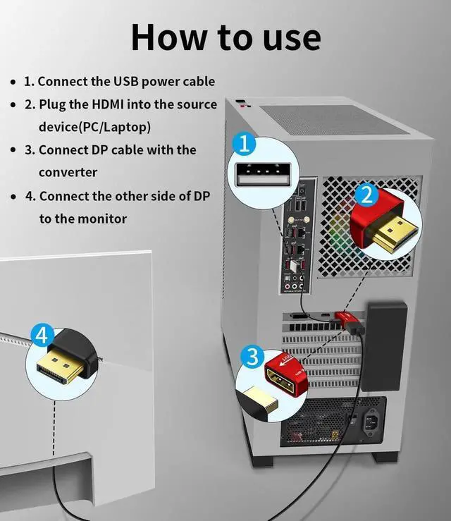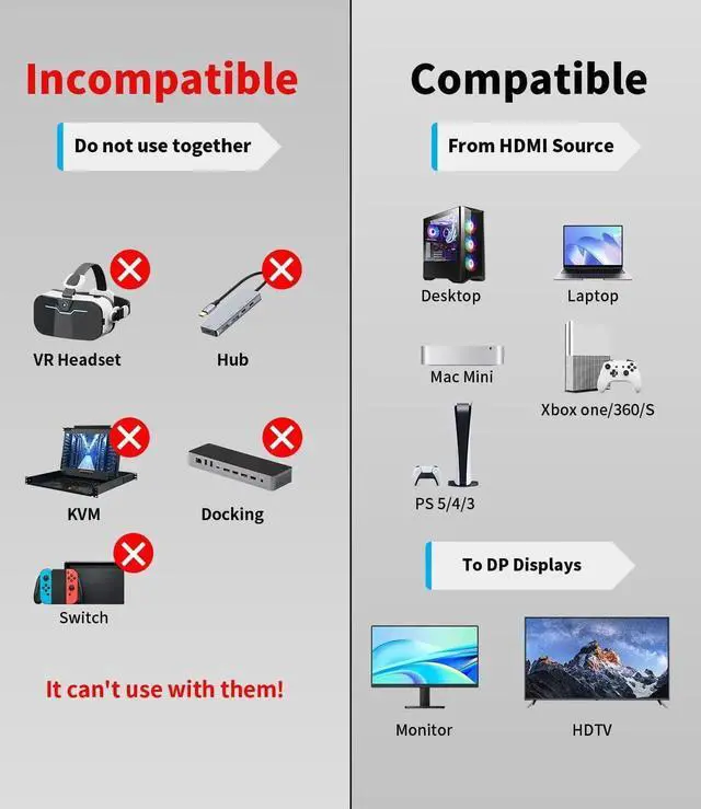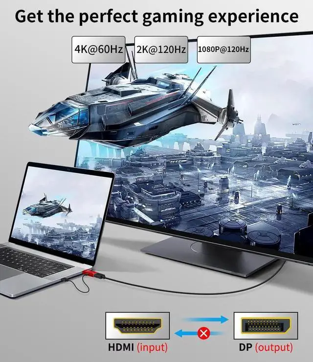This 4K@60Hz HDMI to DisplayPort adapter supports mirroring and extended modes to transfer high-definition signals from the HDMI output ports of laptops and computers to DisplayPort monitors and HDTV and projectors for video games or streaming. Backward compatible with 4K@30Hz, 1080P@120Hz, 1080P@60Hz, 1080i, 720P resolution (Note: only transferred signal from HDMI to DisplayPort unidirectional)