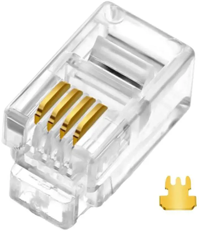RJ9/RJ10/RJ22 4P4C Male plug (4 Position 4 Conductor), Compatible with Both Solid and Stranded Wire RJ9 telephone / fax plugmake the telephone cable using this plug. gold plated contact leads for better data transmitting and higher signal strength. telephone handset cord plugs offer support for phone,fax or voice applications in home or office abling systems.