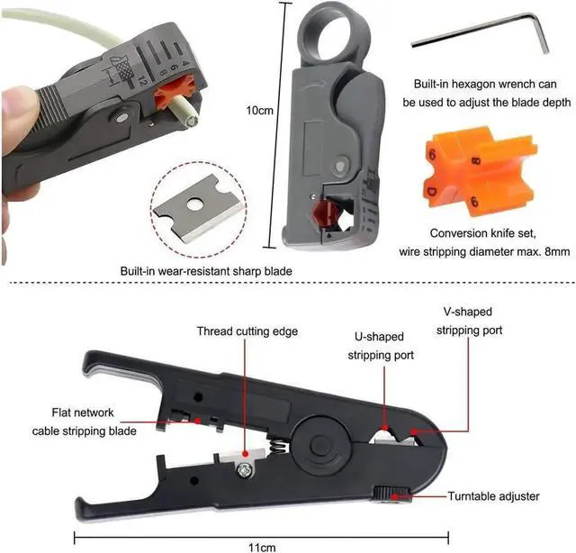 Equipped with coaxial cable stripper, round cable stripper, cutter and flat cable stripper.