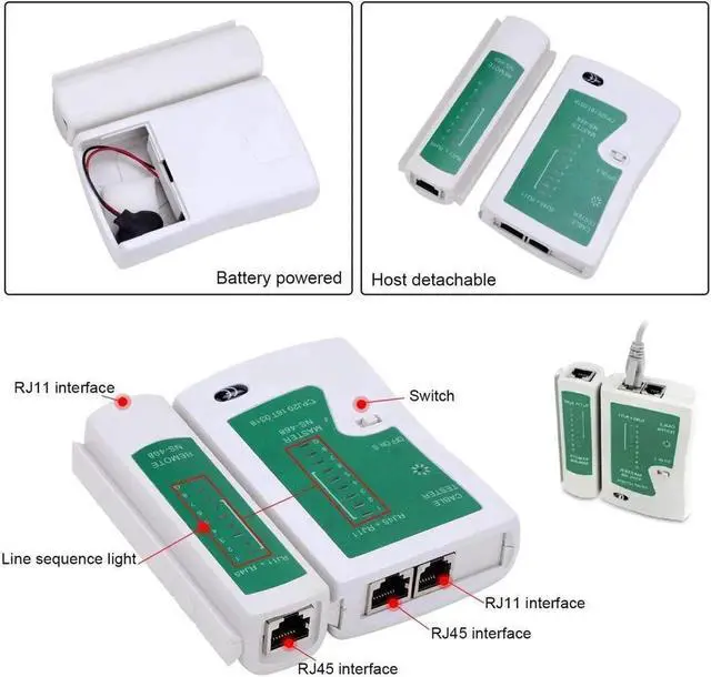 Tests twisted-pair straight & crossover cables: RJ45, RJ11 telephone cables and network cables.