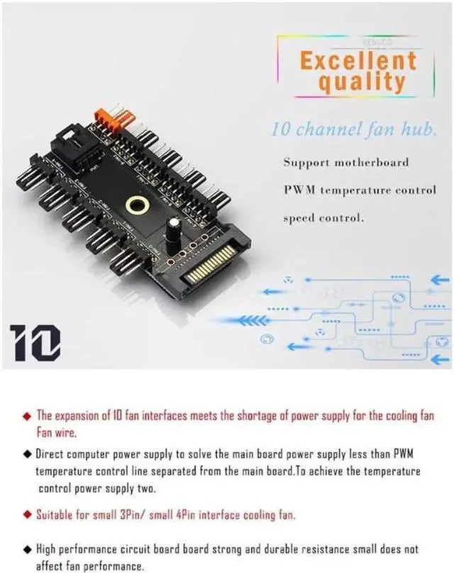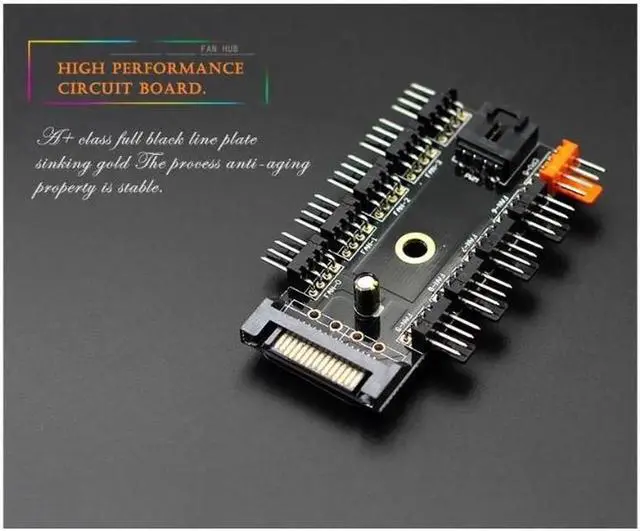 Features: IDE Molex 1 to 10 way cooling fan splitter hub. Designed for 12V 4-Pin fan, support simultaneous starting of 10 channel 4-Pin fans, solving the problem of shortage of motherboard. Widely used for PC computer water cooling system. Support PWM function fan automatic speed regulation. PWM interface is connected to CPU FAN interface on motherboard by PWM cable. The orange interface is the dedicated interface for CPU fan, these black interface are conventional PWM fan interface. EVA double-sided adhesive can be used to fix the hub in the chassis.