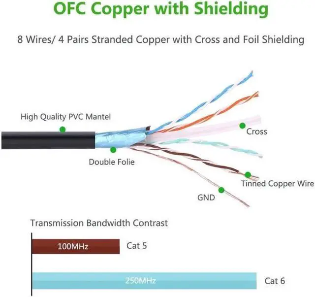 MULTI-SHIELDED Cat6 STANDARD: Ugreen Ethernet extension cable is with gold-plated connector, premium aluminum mylar foil and tinned copper braid shielding; 8 wires Stranded Copper with foil shielding, better than copper clad aluminum (CCA) wire; It conforms to the Category 6 TIA/EIA 568-C. 2 standard.