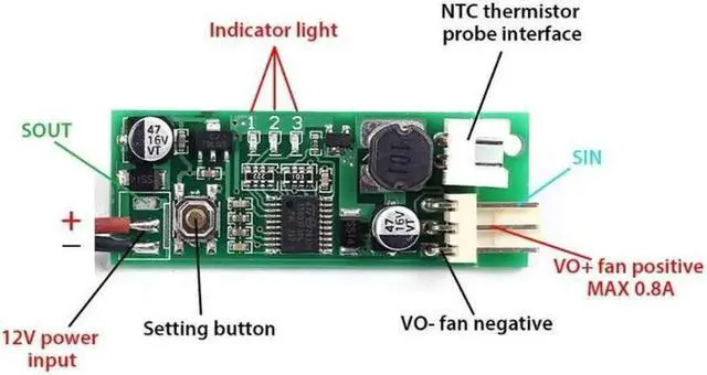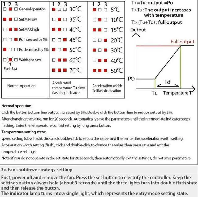Manual Mode: do not install the temperature sensor, then single press (increase) /double press (decrease) the button to change the fan speed(after change the speed and wait 20s, it will save the setting automatically, during this process, the 2th indicator will flash, when the speed can not increase or decrease, the 3 and 1 indicator will flash)