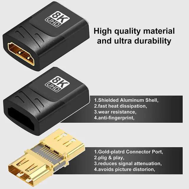 Long-distance extension connection, You can plug one or two HDMI cables into our this HDMI 8k Adapter, then it becomes a whole long HDMI 8K Cable in case you are not convenient for directly connection between your devices or your cable is not long enough between your devices