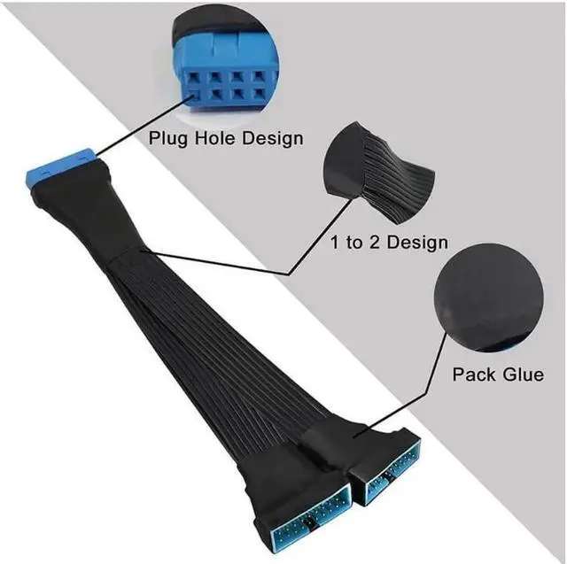 DIY USB 3.0 header extension cable for motherboards, 1 to 2 Y splitter design, supports data transmission speeds of up to 5Gbps, high performance, used for stable signal and data transmission, supports simultaneous bi-directional data transfer, black flat ribbon wire, much more durable and flexible comparing to individual crimped wires