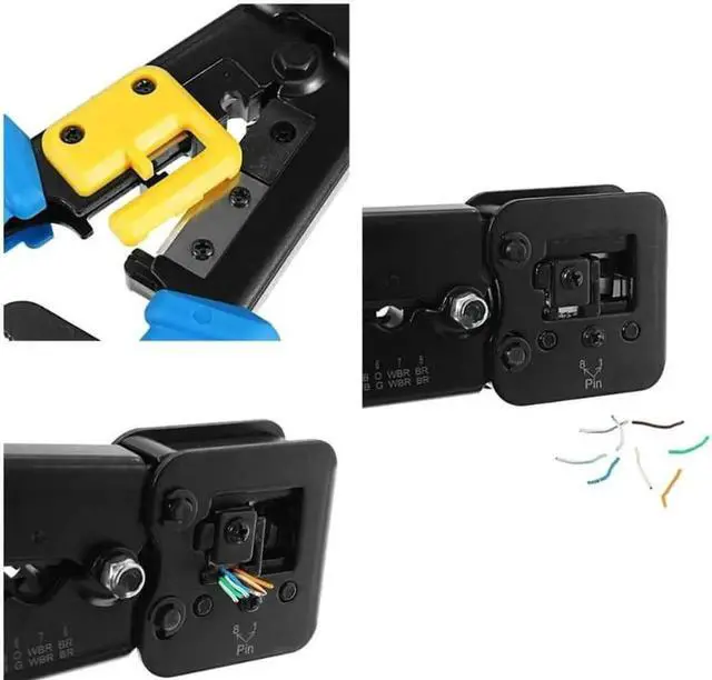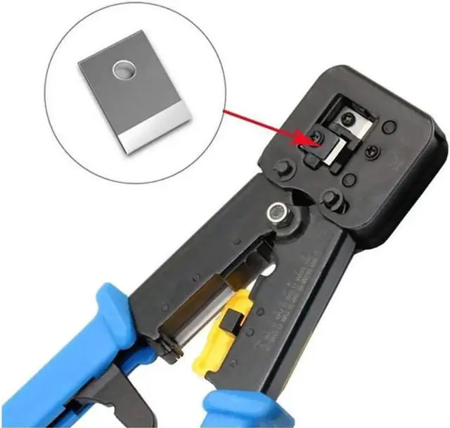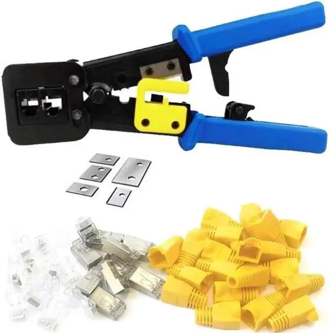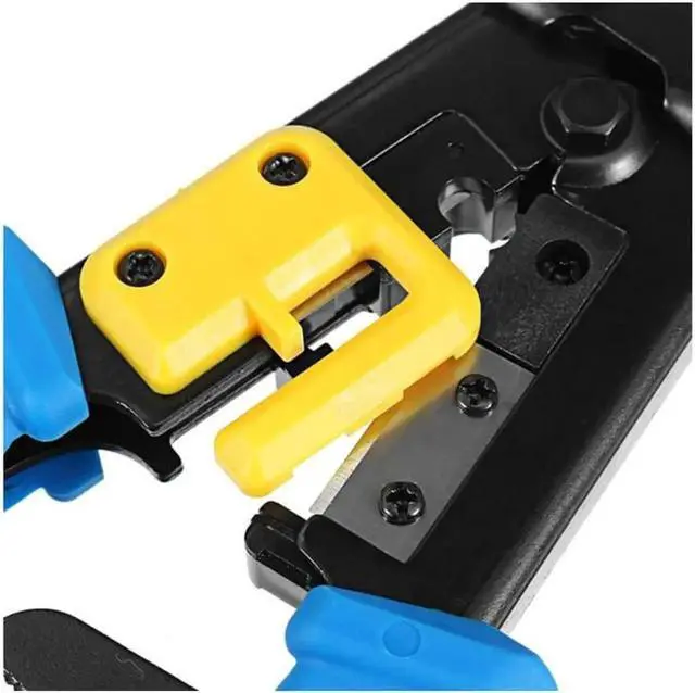 Crimp and trim system delivers a clean, flush trim on the extended conductors for all EZ Connectors, It cuts, strips and terminates RJ11/12 and RJ45 extended copper wires with a precision die head that provides 360 degrees of connector support during the crimping cycle. Our crimp made with heavy duty steel for durability, strength, and delivering more torque during the crimping cycles. Trims and cuts with much less force compered to many tools. Network pliers has the functions of crimping, stripping, and disconnecting. Multifunction in one, practical and convenient, with FREE EXTRA Set of Blades (5pcs), CAT6 Connector (20 pack) and Cable Connector Plug Cover-Yellow (20pcs) INCLUDED | Professional High Performance Tools.