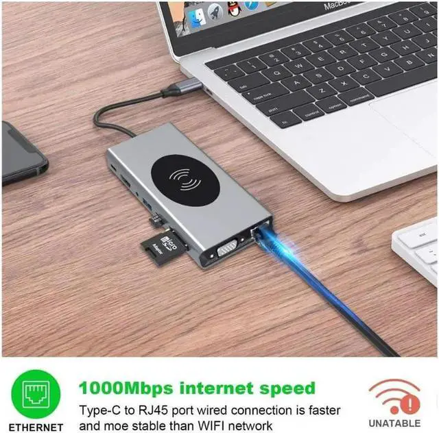 Perfectly work with type c laptop devices like Apple Macbook to covers all the features you need. It including a 4K@30Hz HDMI port, a VGA port, a wireless charger, an SD/TF card reader, 3 USB 3.0 Ports, 4 USB 2.0, Type C PD charging port (charge only), a 3.5 mm audio jack and a Gigabit Ethernet.