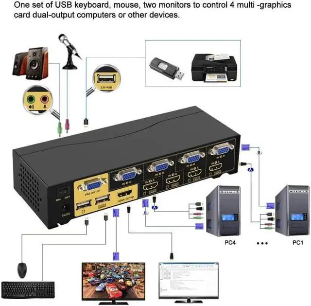 CKL HDMI + VGA Dual Monitor KVM Switch 4 Port with Audio and USB 2. 0 HUB, PC Monitor Keyboard Mouse Switcher Box Mirrored or Extended Display for Computers and Laptops CKL-942HV