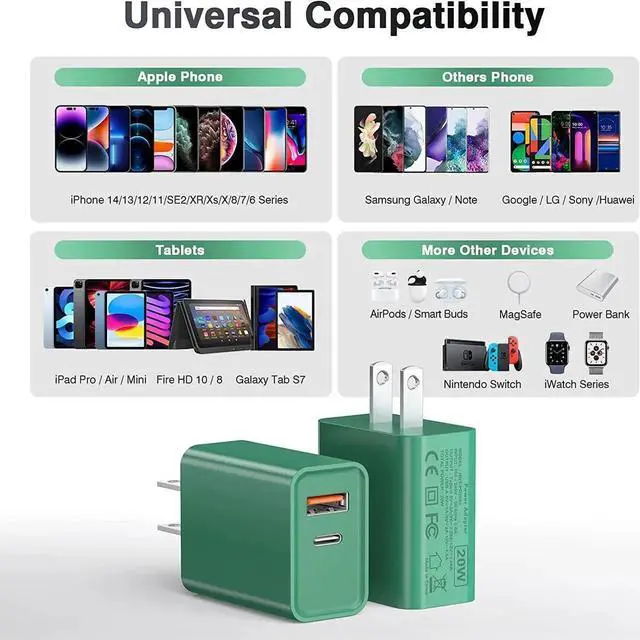 2Pack 20W Type C Charger, Dual Port USB C Wall Plug 20W PD & QC3.0 USB A Fast Charging Block for iPhone, Samsung Galaxy, Google Pixel, Motorola, Oneplus Kindle Cargador Cube Brick Box, Green - OEM