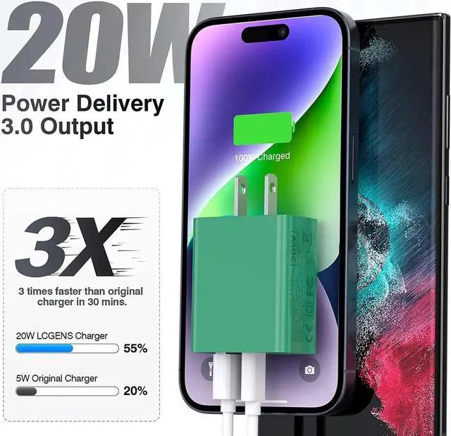 2-Pack Dual Port Fast Charging: Offers fast and efficient charging up to 3X faster than a 5W charger. Charge your iPhone 13 up to 50% capacity in just 30 minutes with the original cable. Cable not included, only 2 Chargers