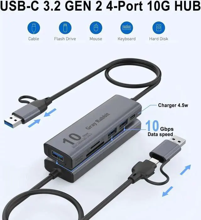 UHS-II SD4.0 and 10Gbps HUB USB 3.2 GEN 2 HUB with UHS2 Card Reader. Has both USB-A and USB-C connectors,(The USB-C connector speed is up to10Gthe USB-A connector speed isHigher than 5G but less than 10G ) it can be used on almost all computers and cell phones, and also has 3 USB 3.2 GEN 2 10G high-speed ports, and Dual-slot UHS I I SD/TF 4.0 Card Reader.NOTE: The HUB does not aceept USB C Power Adapters for Power Delivery pass through to laptop