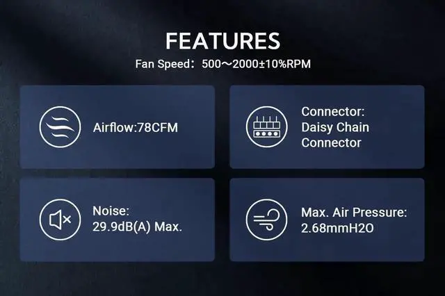 PWM FunctionalThe PWM fan control allows for dynamic speed adjustment between 500 rpm to 2, 000 rpm, minimizing noise or maximizing airflow. Noise: 29.9dB(A) Max.
